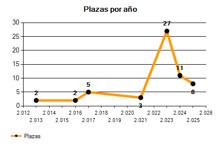 En los siguientes gráficos se puede ver la evolución del número de convocatorias y plazas convocadas para la profesión de Matarife de los últimos años pudiéndose observar un crecimiento del 300,00% desde el año 2013 hasta el 2025 en número de convocatorias y un crecimiento del 300,00% en número de plazas convocadas.