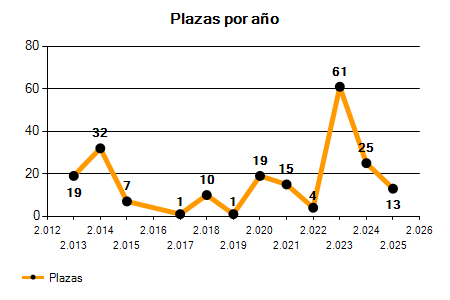 En los siguientes gráficos se puede ver la evolución del número de convocatorias y plazas convocadas para la profesión de Mecánico conductor de los últimos años pudiéndose observar un crecimiento del 200,00% desde el año 2013 hasta el 2025 en número de convocatorias y una caída del 31,58% en número de plazas convocadas.