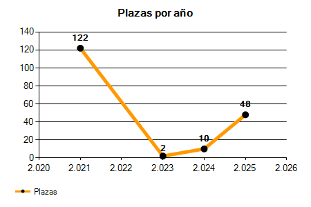En los siguientes gráficos se puede ver la evolución del número de convocatorias y plazas convocadas para la profesión de Médico/a de Urgencias de Atención Primaria de los últimos años pudiéndose observar una caída del 80,00% desde el año 2021 hasta el 2025 en número de convocatorias y una caída del 60,66% en número de plazas convocadas.