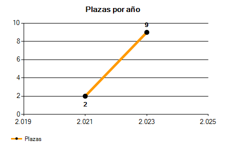 En los siguientes gráficos se puede ver la evolución del número de convocatorias y plazas convocadas para la profesión de Monitor/a de Servicios Sociales de los últimos años pudiéndose observar una caída del 100,00% desde el año 2021 hasta el 2025 en número de convocatorias y una caída del 100,00% en número de plazas convocadas.