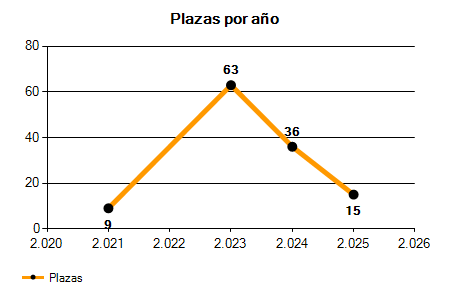 En los siguientes gráficos se puede ver la evolución del número de convocatorias y plazas convocadas para la profesión de Monitor/a Ocupacional de los últimos años pudiéndose observar una caída del 33,33% desde el año 2021 hasta el 2025 en número de convocatorias y un crecimiento del 66,67% en número de plazas convocadas.