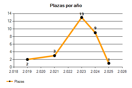 En los siguientes gráficos se puede ver la evolución del número de convocatorias y plazas convocadas para la profesión de Monitor de Gimnasia Rítmica de los últimos años pudiéndose observar un crecimiento y una caída del 0,00% desde el año 2019 hasta el 2025 en número de convocatorias y una caída del 50,00% en número de plazas convocadas.