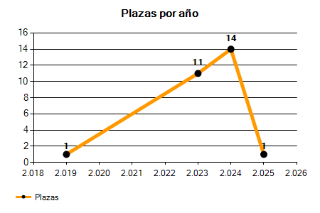En los siguientes gráficos se puede ver la evolución del número de convocatorias y plazas convocadas para la profesión de Monitor de Tenis de los últimos años pudiéndose observar un crecimiento y una caída del 0,00% desde el año 2019 hasta el 2025 en número de convocatorias y un crecimiento y una caída del 0,00% en número de plazas convocadas.