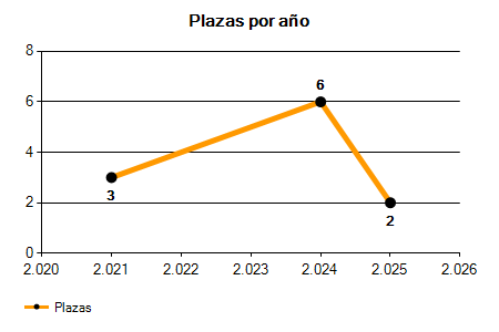 En los siguientes gráficos se puede ver la evolución del número de convocatorias y plazas convocadas para la profesión de Oficial 1.ª Agrario de los últimos años pudiéndose observar un crecimiento del 100,00% desde el año 2021 hasta el 2025 en número de convocatorias y una caída del 33,33% en número de plazas convocadas.