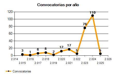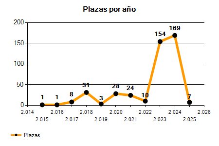 En los siguientes gráficos se puede ver la evolución del número de convocatorias y plazas convocadas para la profesión de Oficial de Explotación y Obras de los últimos años pudiéndose observar un crecimiento del 66,67% desde el año 2015 hasta el 2025 en número de convocatorias y un crecimiento del 600,00% en número de plazas convocadas.