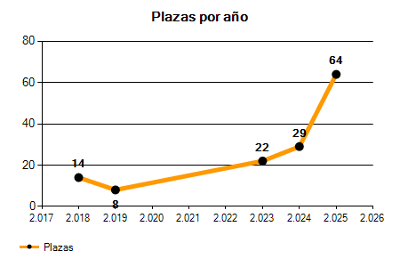 En los siguientes gráficos se puede ver la evolución del número de convocatorias y plazas convocadas para la profesión de Oficial de Planta Potabilizadora de los últimos años pudiéndose observar una caída del 33,33% desde el año 2018 hasta el 2025 en número de convocatorias y un crecimiento del 357,14% en número de plazas convocadas.