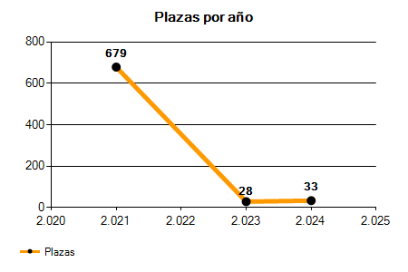 En los siguientes gráficos se puede ver la evolución del número de convocatorias y plazas convocadas para la profesión de Personal Especializado en Servicios Domésticos de los últimos años pudiéndose observar una caída del 100,00% desde el año 2021 hasta el 2025 en número de convocatorias y una caída del 100,00% en número de plazas convocadas.