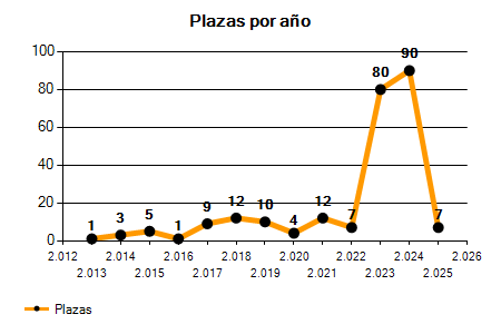 En los siguientes gráficos se puede ver la evolución del número de convocatorias y plazas convocadas para la profesión de Pintor de los últimos años pudiéndose observar un crecimiento del 500,00% desde el año 2013 hasta el 2025 en número de convocatorias y un crecimiento del 600,00% en número de plazas convocadas.