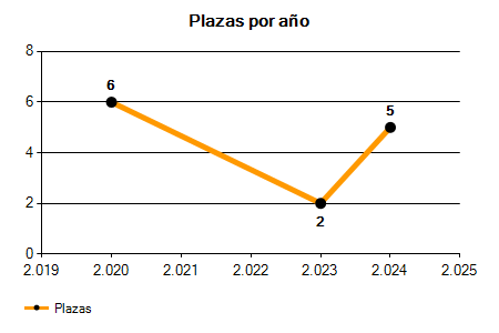 En los siguientes gráficos se puede ver la evolución del número de convocatorias y plazas convocadas para la profesión de Profesor/a de Cerámica de los últimos años pudiéndose observar una caída del 100,00% desde el año 2020 hasta el 2025 en número de convocatorias y una caída del 100,00% en número de plazas convocadas.