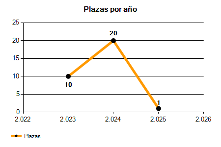 En los siguientes gráficos se puede ver la evolución del número de convocatorias y plazas convocadas para la profesión de Profesor/a de Música especialidad-Canto de los últimos años pudiéndose observar una caída del 88,89% desde el año 2023 hasta el 2025 en número de convocatorias y una caída del 90,00% en número de plazas convocadas.