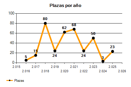 En los siguientes gráficos se puede ver la evolución del número de convocatorias y plazas convocadas para la profesión de Profesor de Asesoría y procesos de imagen personal (Sec) de los últimos años pudiéndose observar una caída del 33,33% desde el año 2016 hasta el 2025 en número de convocatorias y un crecimiento del 360,00% en número de plazas convocadas.