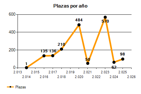 En los siguientes gráficos se puede ver la evolución del número de convocatorias y plazas convocadas para la profesión de Profesor de Lengua Catalana y Literatura (Secundaria) de los últimos años pudiéndose observar un crecimiento del 200,00% desde el año 2014 hasta el 2025 en número de convocatorias y un crecimiento del 9.700,00% en número de plazas convocadas.