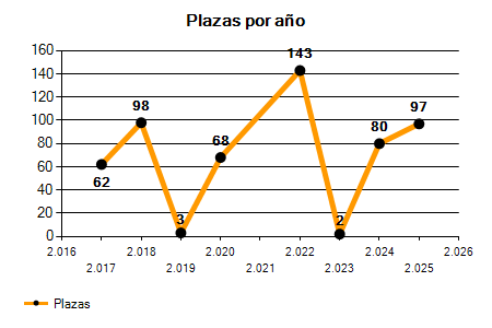 En los siguientes gráficos se puede ver la evolución del número de convocatorias y plazas convocadas para la profesión de Profesor de Lengua Gallega y Literatura (Secundaria) de los últimos años pudiéndose observar un crecimiento y una caída del 0,00% desde el año 2017 hasta el 2025 en número de convocatorias y un crecimiento del 56,45% en número de plazas convocadas.