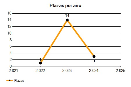 En los siguientes gráficos se puede ver la evolución del número de convocatorias y plazas convocadas para la profesión de Profesor de Música de Acordeón de los últimos años pudiéndose observar una caída del 100,00% desde el año 2022 hasta el 2025 en número de convocatorias y una caída del 100,00% en número de plazas convocadas.