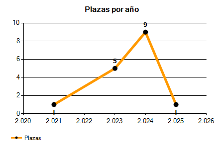 En los siguientes gráficos se puede ver la evolución del número de convocatorias y plazas convocadas para la profesión de Profesor de Música de Fagot de los últimos años pudiéndose observar un crecimiento y una caída del 0,00% desde el año 2021 hasta el 2025 en número de convocatorias y un crecimiento y una caída del 0,00% en número de plazas convocadas.