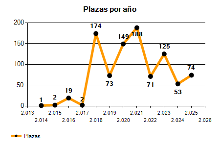 En los siguientes gráficos se puede ver la evolución del número de convocatorias y plazas convocadas para la profesión de Profesor de Organización y Gestión Comercial (Secundaria) de los últimos años pudiéndose observar un crecimiento del 300,00% desde el año 2014 hasta el 2025 en número de convocatorias y un crecimiento del 7.300,00% en número de plazas convocadas.