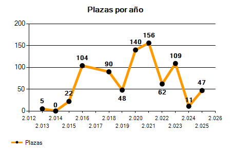 En los siguientes gráficos se puede ver la evolución del número de convocatorias y plazas convocadas para la profesión de Profesor de Procesos Sanitarios (Secundaria) de los últimos años pudiéndose observar un crecimiento del 400,00% desde el año 2013 hasta el 2025 en número de convocatorias y un crecimiento del 840,00% en número de plazas convocadas.