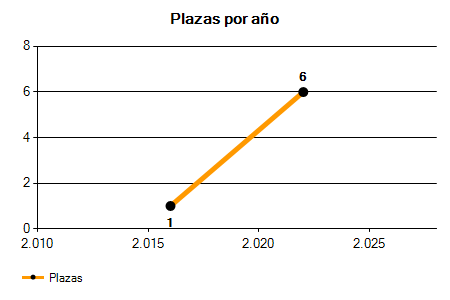 En los siguientes gráficos se puede ver la evolución del número de convocatorias y plazas convocadas para la profesión de Profesor de Procesos y Productos de Vidrio y Cerámica (Secundaria) de los últimos años pudiéndose observar una caída del 100,00% desde el año 2016 hasta el 2025 en número de convocatorias y una caída del 100,00% en número de plazas convocadas.