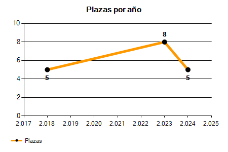En los siguientes gráficos se puede ver la evolución del número de convocatorias y plazas convocadas para la profesión de Profesores/as de Escuela Básica de Adultos de los últimos años pudiéndose observar una caída del 100,00% desde el año 2018 hasta el 2025 en número de convocatorias y una caída del 100,00% en número de plazas convocadas.
