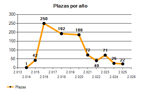 En los siguientes gráficos se puede ver la evolución del número de convocatorias y plazas convocadas para la profesión de Profesores Escuela Oficial de Idiomas. Ingles de los últimos años pudiéndose observar un crecimiento del 100,00% desde el año 2014 hasta el 2025 en número de convocatorias y un crecimiento del 2.100,00% en número de plazas convocadas.