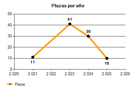 En los siguientes gráficos se puede ver la evolución del número de convocatorias y plazas convocadas para la profesión de Programador Operador de los últimos años pudiéndose observar un crecimiento y una caída del 0,00% desde el año 2021 hasta el 2025 en número de convocatorias y una caída del 9,09% en número de plazas convocadas.