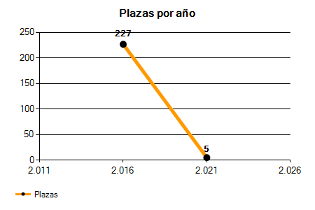 En los siguientes gráficos se puede ver la evolución del número de convocatorias y plazas convocadas para la profesión de Psiquiatría de los últimos años pudiéndose observar una caída del 100,00% desde el año 2018 hasta el 2025 en número de convocatorias y una caída del 100,00% en número de plazas convocadas.