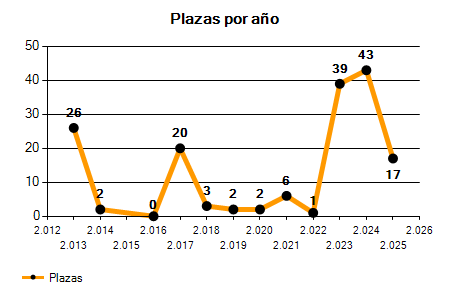 En los siguientes gráficos se puede ver la evolución del número de convocatorias y plazas convocadas para la profesión de Recepcionista de los últimos años pudiéndose observar un crecimiento del 28,57% desde el año 2013 hasta el 2025 en número de convocatorias y una caída del 34,62% en número de plazas convocadas.
