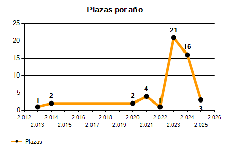 En los siguientes gráficos se puede ver la evolución del número de convocatorias y plazas convocadas para la profesión de Redactor de los últimos años pudiéndose observar un crecimiento del 100,00% desde el año 2013 hasta el 2025 en número de convocatorias y un crecimiento del 200,00% en número de plazas convocadas.