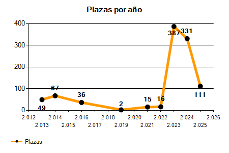 En los siguientes gráficos se puede ver la evolución del número de convocatorias y plazas convocadas para la profesión de Socorrista de los últimos años pudiéndose observar un crecimiento del 57,89% desde el año 2013 hasta el 2025 en número de convocatorias y un crecimiento del 126,53% en número de plazas convocadas.
