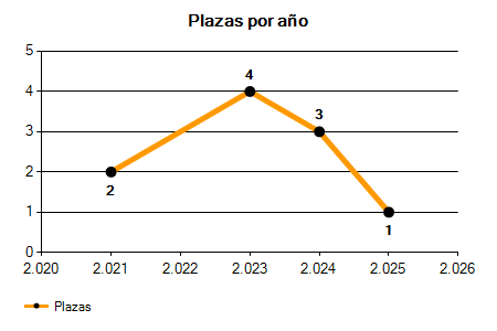 En los siguientes gráficos se puede ver la evolución del número de convocatorias y plazas convocadas para la profesión de Supervisor de Obras de los últimos años pudiéndose observar un crecimiento y una caída del 0,00% desde el año 2021 hasta el 2025 en número de convocatorias y una caída del 50,00% en número de plazas convocadas.