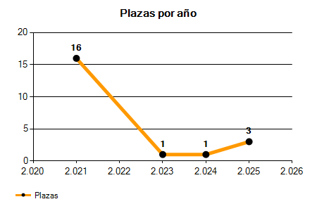 En los siguientes gráficos se puede ver la evolución del número de convocatorias y plazas convocadas para la profesión de Técnico/a Agrícola de los últimos años pudiéndose observar una caída del 66,67% desde el año 2021 hasta el 2025 en número de convocatorias y una caída del 81,25% en número de plazas convocadas.