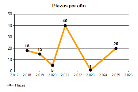 En los siguientes gráficos se puede ver la evolución del número de convocatorias y plazas convocadas para la profesión de Técnico/a Auxiliar de Instalaciones Deportivas de los últimos años pudiéndose observar un crecimiento del 200,00% desde el año 2018 hasta el 2025 en número de convocatorias y un crecimiento del 11,11% en número de plazas convocadas.