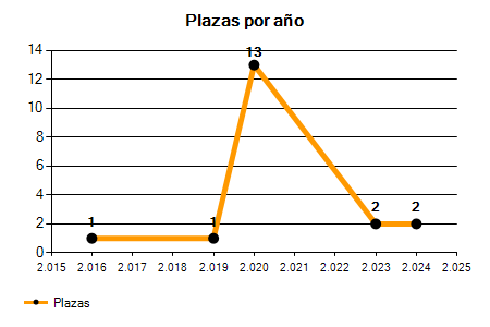 En los siguientes gráficos se puede ver la evolución del número de convocatorias y plazas convocadas para la profesión de Técnico/a en Cartografía de los últimos años pudiéndose observar una caída del 100,00% desde el año 2016 hasta el 2025 en número de convocatorias y una caída del 100,00% en número de plazas convocadas.