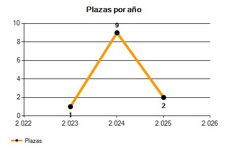 En los siguientes gráficos se puede ver la evolución del número de convocatorias y plazas convocadas para la profesión de Técnico/a en Consumo de los últimos años pudiéndose observar un crecimiento y una caída del 0,00% desde el año 2023 hasta el 2025 en número de convocatorias y un crecimiento del 100,00% en número de plazas convocadas.