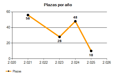 En los siguientes gráficos se puede ver la evolución del número de convocatorias y plazas convocadas para la profesión de Técnico/a Especialista de Tecnologías de la Información de los últimos años pudiéndose observar una caída del 33,33% desde el año 2021 hasta el 2025 en número de convocatorias y una caída del 82,14% en número de plazas convocadas.