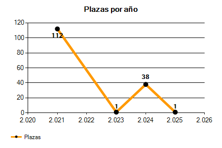 En los siguientes gráficos se puede ver la evolución del número de convocatorias y plazas convocadas para la profesión de Técnico/a Superior en Tecnologías de la Información y la Comunicación (TIC) de los últimos años pudiéndose observar una caída del 85,71% desde el año 2021 hasta el 2025 en número de convocatorias y una caída del 99,11% en número de plazas convocadas.