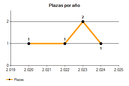 En los siguientes gráficos se puede ver la evolución del número de convocatorias y plazas convocadas para la profesión de Técnico Auxiliar de Inserción Laboral de los últimos años pudiéndose observar una caída del 100,00% desde el año 2020 hasta el 2025 en número de convocatorias y una caída del 100,00% en número de plazas convocadas.