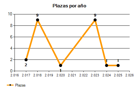 En los siguientes gráficos se puede ver la evolución del número de convocatorias y plazas convocadas para la profesión de Técnico de Agricultura de los últimos años pudiéndose observar un crecimiento y una caída del 0,00% desde el año 2017 hasta el 2025 en número de convocatorias y una caída del 50,00% en número de plazas convocadas.