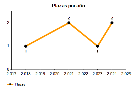 En los siguientes gráficos se puede ver la evolución del número de convocatorias y plazas convocadas para la profesión de Técnico de Análisis Territorial de los últimos años pudiéndose observar una caída del 100,00% desde el año 2018 hasta el 2025 en número de convocatorias y una caída del 100,00% en número de plazas convocadas.