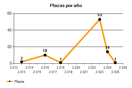 En los siguientes gráficos se puede ver la evolución del número de convocatorias y plazas convocadas para la profesión de Técnico de Apoyo de los últimos años pudiéndose observar una caída del 50,00% desde el año 2013 hasta el 2025 en número de convocatorias y una caída del 50,00% en número de plazas convocadas.