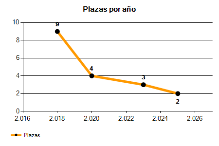 En los siguientes gráficos se puede ver la evolución del número de convocatorias y plazas convocadas para la profesión de Técnico de Artes Gráficas de los últimos años pudiéndose observar un crecimiento del 200,00% desde el año 2018 hasta el 2025 en número de convocatorias y una caída del 77,78% en número de plazas convocadas.