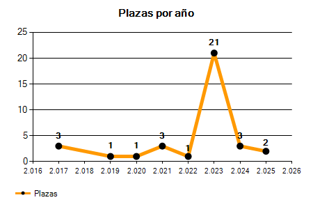 En los siguientes gráficos se puede ver la evolución del número de convocatorias y plazas convocadas para la profesión de Técnico de Gestión Presupuestaria de los últimos años pudiéndose observar una caída del 50,00% desde el año 2017 hasta el 2025 en número de convocatorias y una caída del 33,33% en número de plazas convocadas.