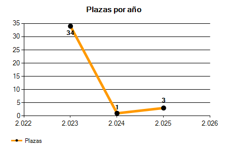 En los siguientes gráficos se puede ver la evolución del número de convocatorias y plazas convocadas para la profesión de Técnico de Gestión Recaudación de los últimos años pudiéndose observar una caída del 82,35% desde el año 2023 hasta el 2025 en número de convocatorias y una caída del 91,18% en número de plazas convocadas.