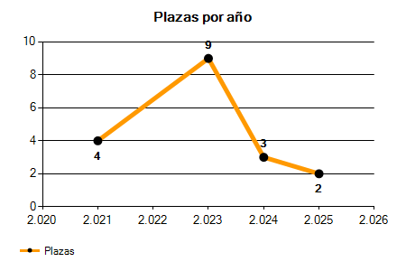 En los siguientes gráficos se puede ver la evolución del número de convocatorias y plazas convocadas para la profesión de Técnico de Medios Audiovisuales de los últimos años pudiéndose observar una caída del 50,00% desde el año 2021 hasta el 2025 en número de convocatorias y una caída del 50,00% en número de plazas convocadas.