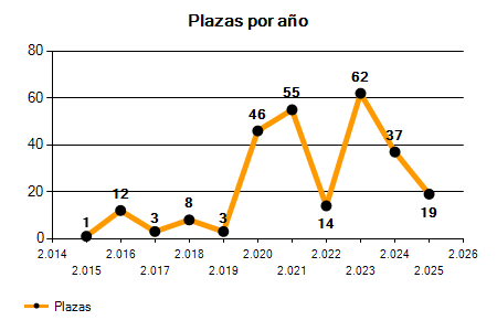 En los siguientes gráficos se puede ver la evolución del número de convocatorias y plazas convocadas para la profesión de Técnico de Promoción Económica de los últimos años pudiéndose observar un crecimiento del 200,00% desde el año 2015 hasta el 2025 en número de convocatorias y un crecimiento del 1.800,00% en número de plazas convocadas.