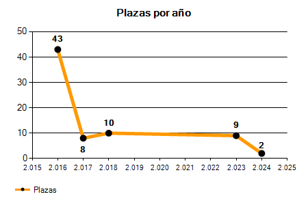 En los siguientes gráficos se puede ver la evolución del número de convocatorias y plazas convocadas para la profesión de Técnico de Seguridad e Higiene en el Trabajo de los últimos años pudiéndose observar una caída del 100,00% desde el año 2016 hasta el 2025 en número de convocatorias y una caída del 100,00% en número de plazas convocadas.