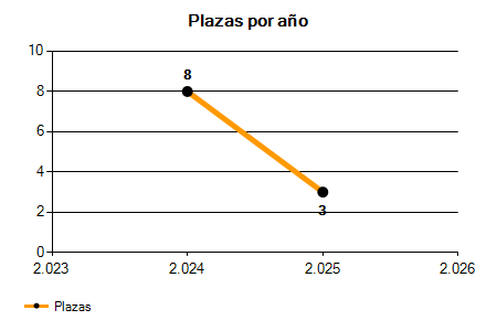 En los siguientes gráficos se puede ver la evolución del número de convocatorias y plazas convocadas para la profesión de Técnico en Gestión de Museo de los últimos años pudiéndose observar una caída del 62,50% desde el año 2024 hasta el 2025 en número de convocatorias y una caída del 62,50% en número de plazas convocadas.