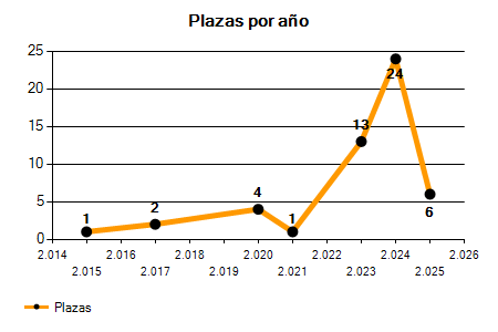En los siguientes gráficos se puede ver la evolución del número de convocatorias y plazas convocadas para la profesión de Técnico Superior de Proyectos de los últimos años pudiéndose observar un crecimiento del 500,00% desde el año 2015 hasta el 2025 en número de convocatorias y un crecimiento del 500,00% en número de plazas convocadas.