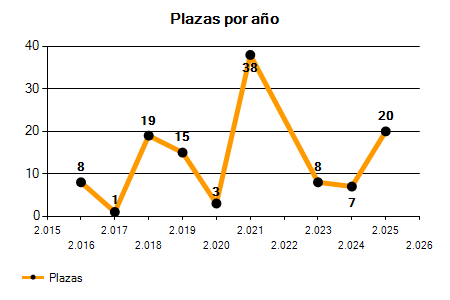 En los siguientes gráficos se puede ver la evolución del número de convocatorias y plazas convocadas para la profesión de Técnico Superior en Organización de los últimos años pudiéndose observar un crecimiento del 100,00% desde el año 2016 hasta el 2025 en número de convocatorias y un crecimiento del 150,00% en número de plazas convocadas.