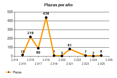 En los siguientes gráficos se puede ver la evolución del número de convocatorias y plazas convocadas para la profesión de Técnicos Auxiliares Mantenimiento de los últimos años pudiéndose observar una caída del 66,67% desde el año 2015 hasta el 2025 en número de convocatorias y una caída del 46,67% en número de plazas convocadas.